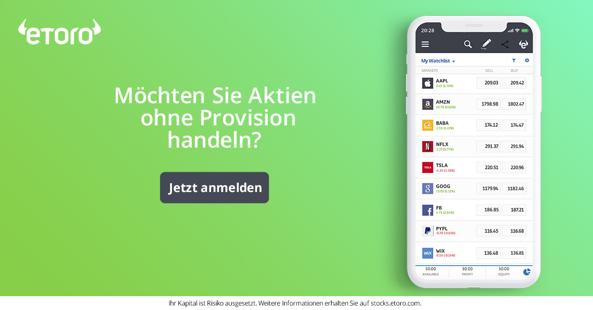 Die Plattform ist sehr benutzerfreundlich, sowohl für Einsteiger als auch für erfahrene Anleger bestens geeignet. Mehr als 20 Millionen Kunden begeistert eToro mit einem gut ausgebauten Handelsangebot - um nur einige zu nennen - Tesla, Amazon, NIO, Bayer, Apple und Lufthansa sowie 252 ETFs.